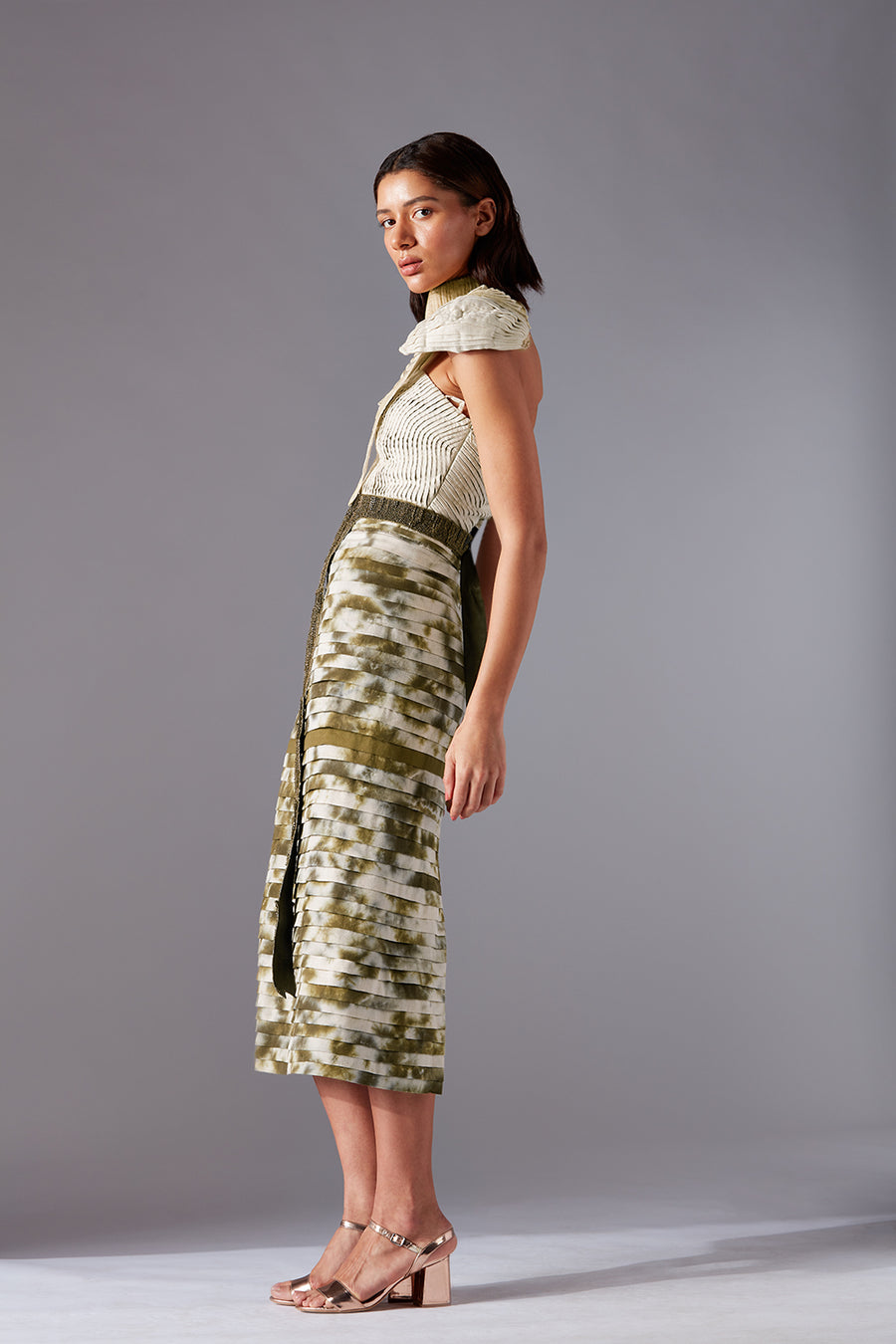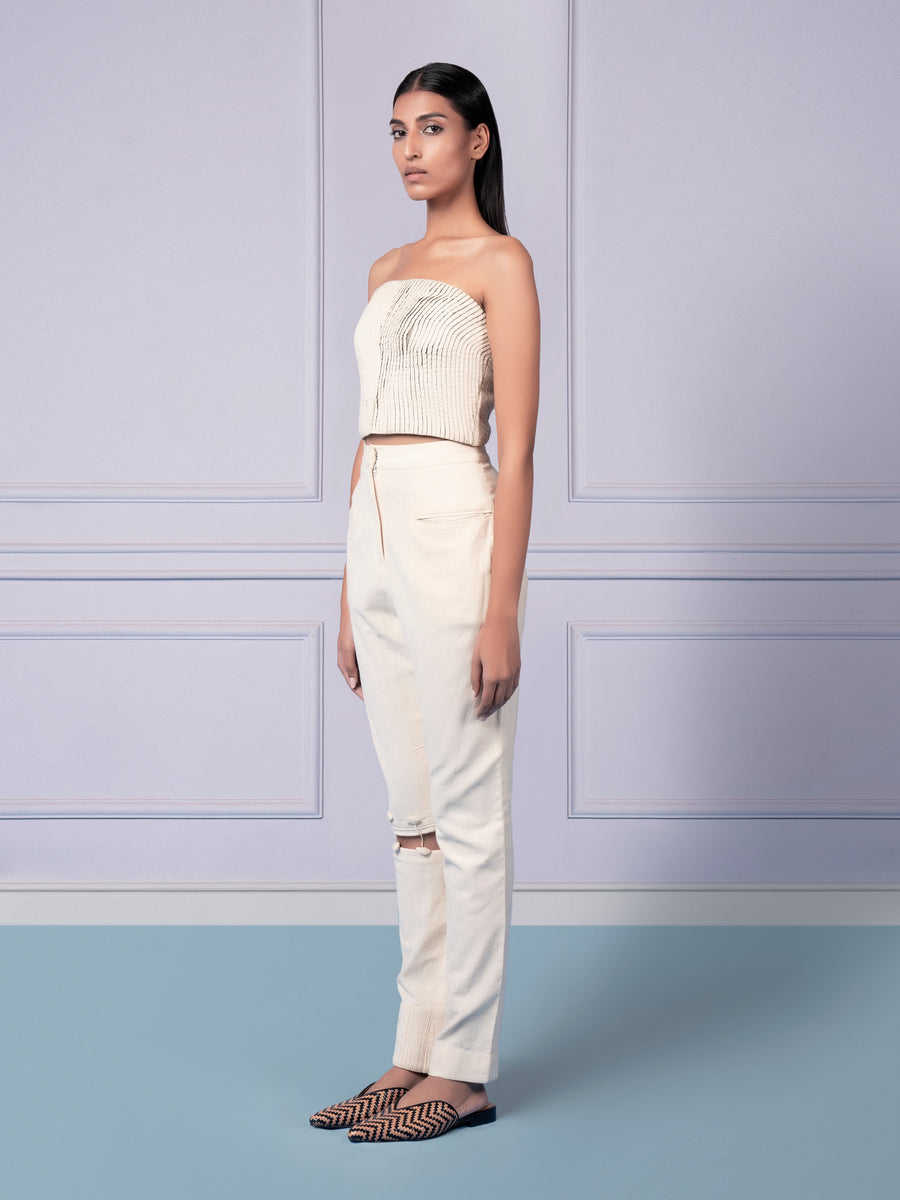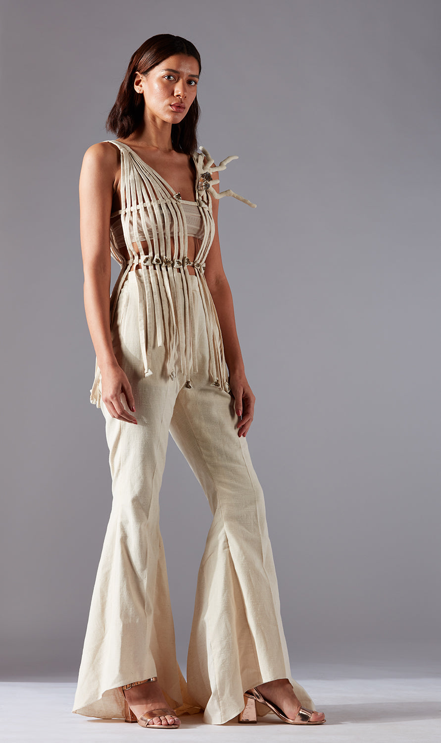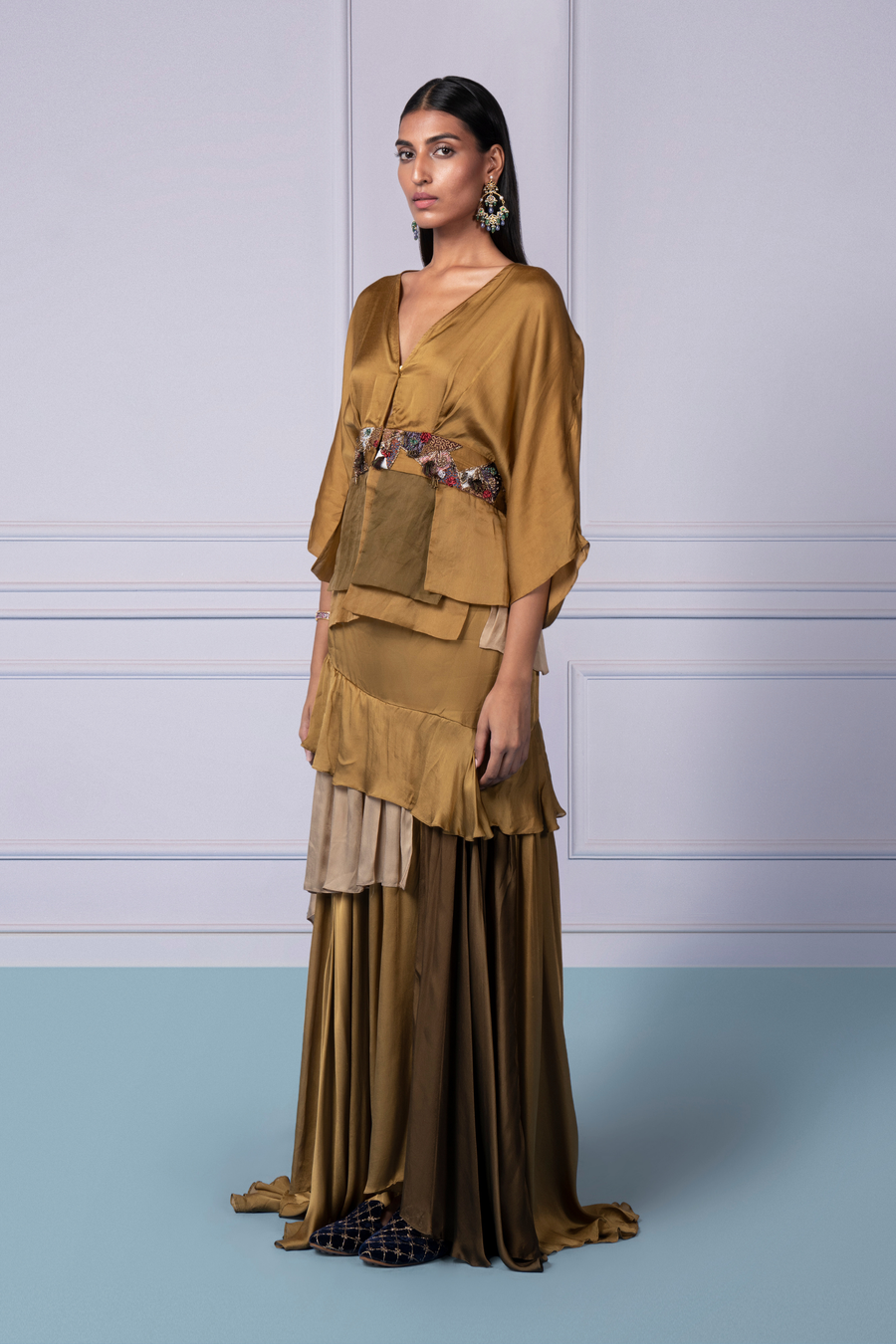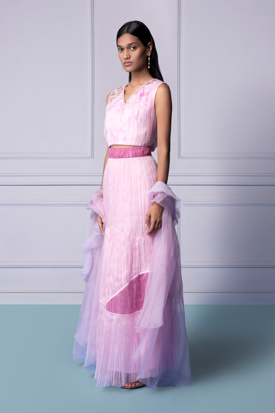 Carpet Jacket With Ruching Crop Top and Colour block Layered Pants