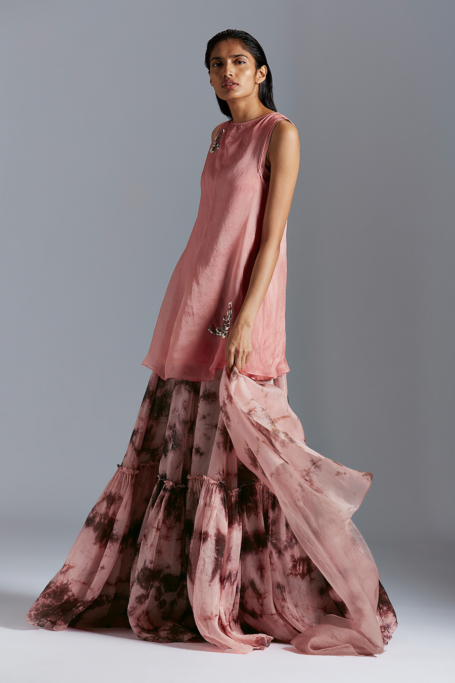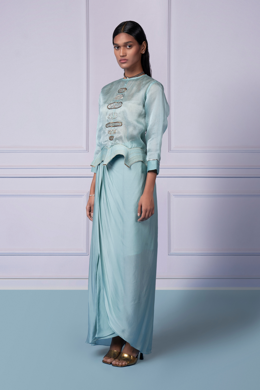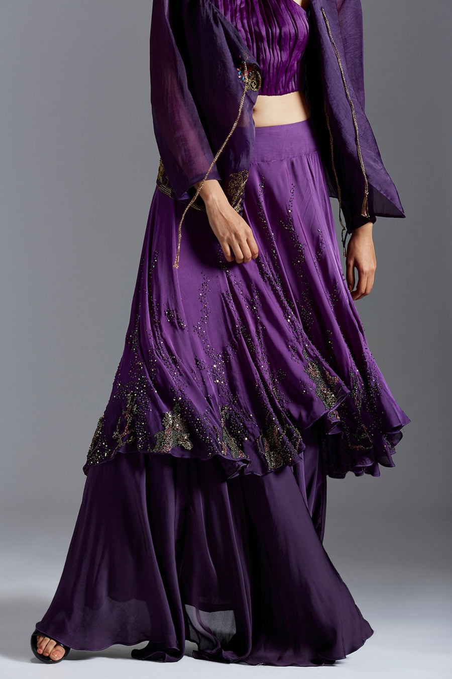 Rouching Crop Top With Day & Night Layer Skirt And Angarakha coat