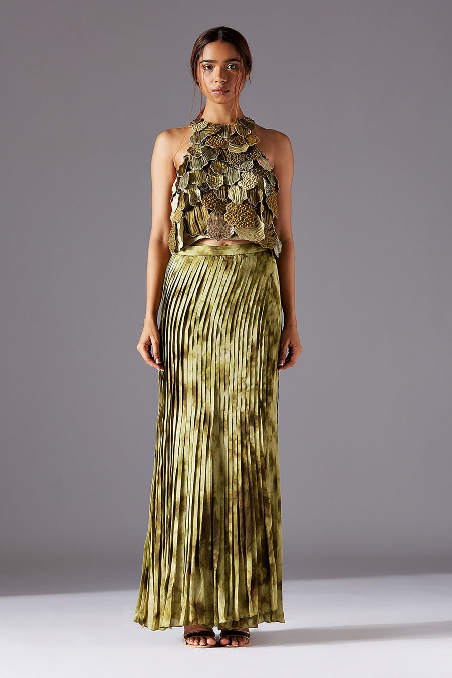 Mima Mounds Top With Marsh-Scapes Pleated Skirt and Living Stole- Dupatta