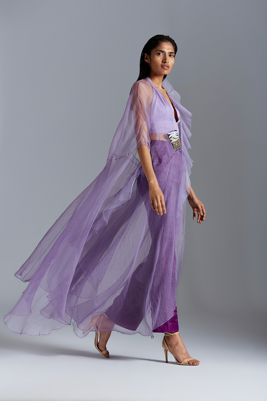 Carpet Jacket With Ruching Crop Top and Colour block Layered Pants